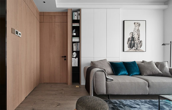 沙发背景墙同样是白色,配上灰色的双人位布艺沙发,营造出轻松舒适的家居氛围,简洁时尚不失设计感。沙发墙上的壁龛设计实用性和装饰效果都非常不错,值得装修时借鉴学习。局部墙面采用原木色集成板材来装饰,再配上原木色的房门,隐形式的房门设计,看起来非常巧妙。