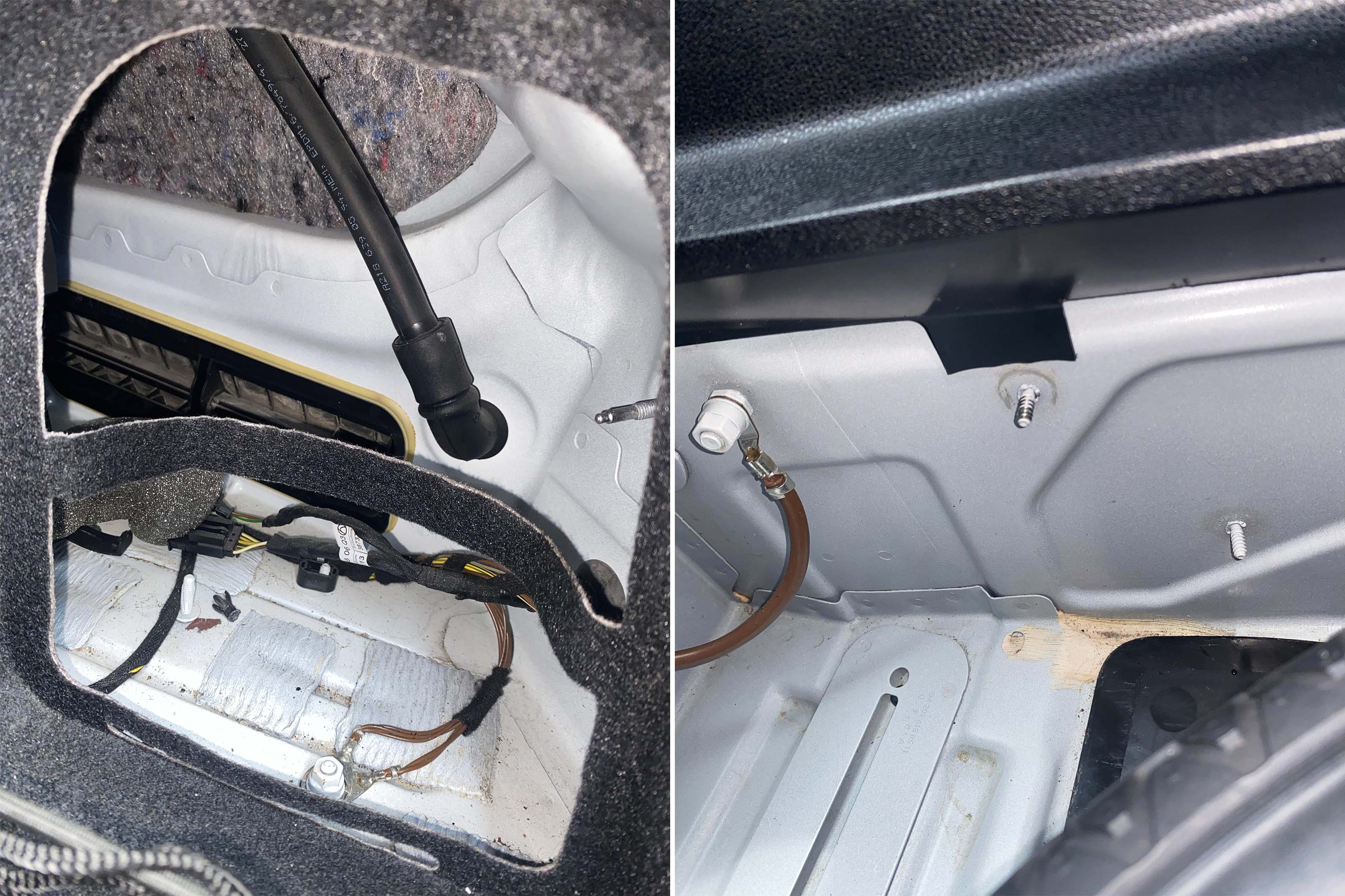 前部看完我们再把检测的目光放到车辆的后部,后备箱打开后未发现车内存在其它杂物。
