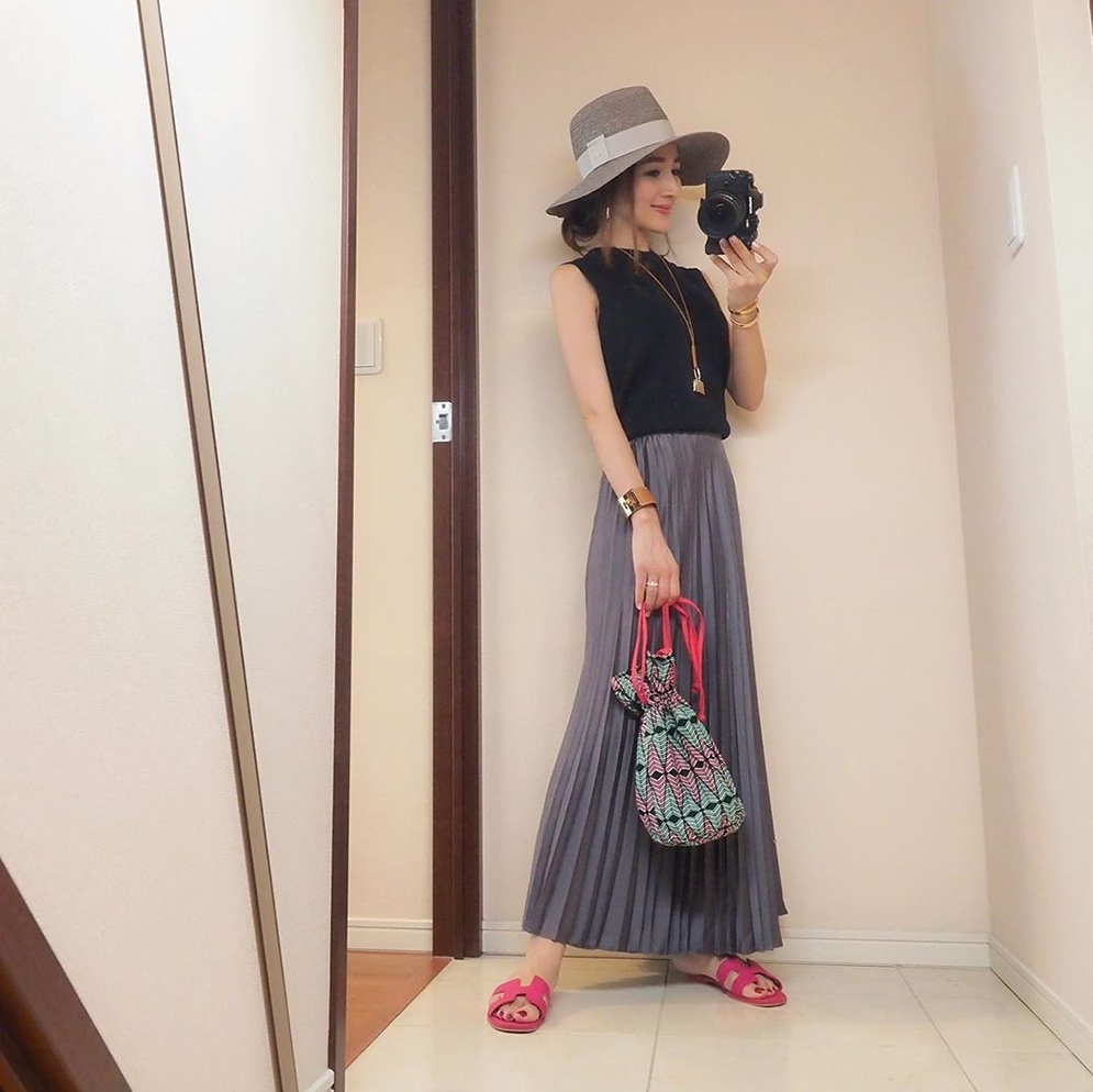 来看这一身:黑色的无袖T+蓝灰色的百褶A字裙,慵懒随性与端庄温柔,在这套Look中被巧妙的平衡。起到过渡性质的单品,就是这顶灰色的渔夫帽了,抛去了繁杂凌乱的装饰,是一种柔和又轻快的视觉冲击。在简单搭配中,配饰的作用是不能够被忽视的。