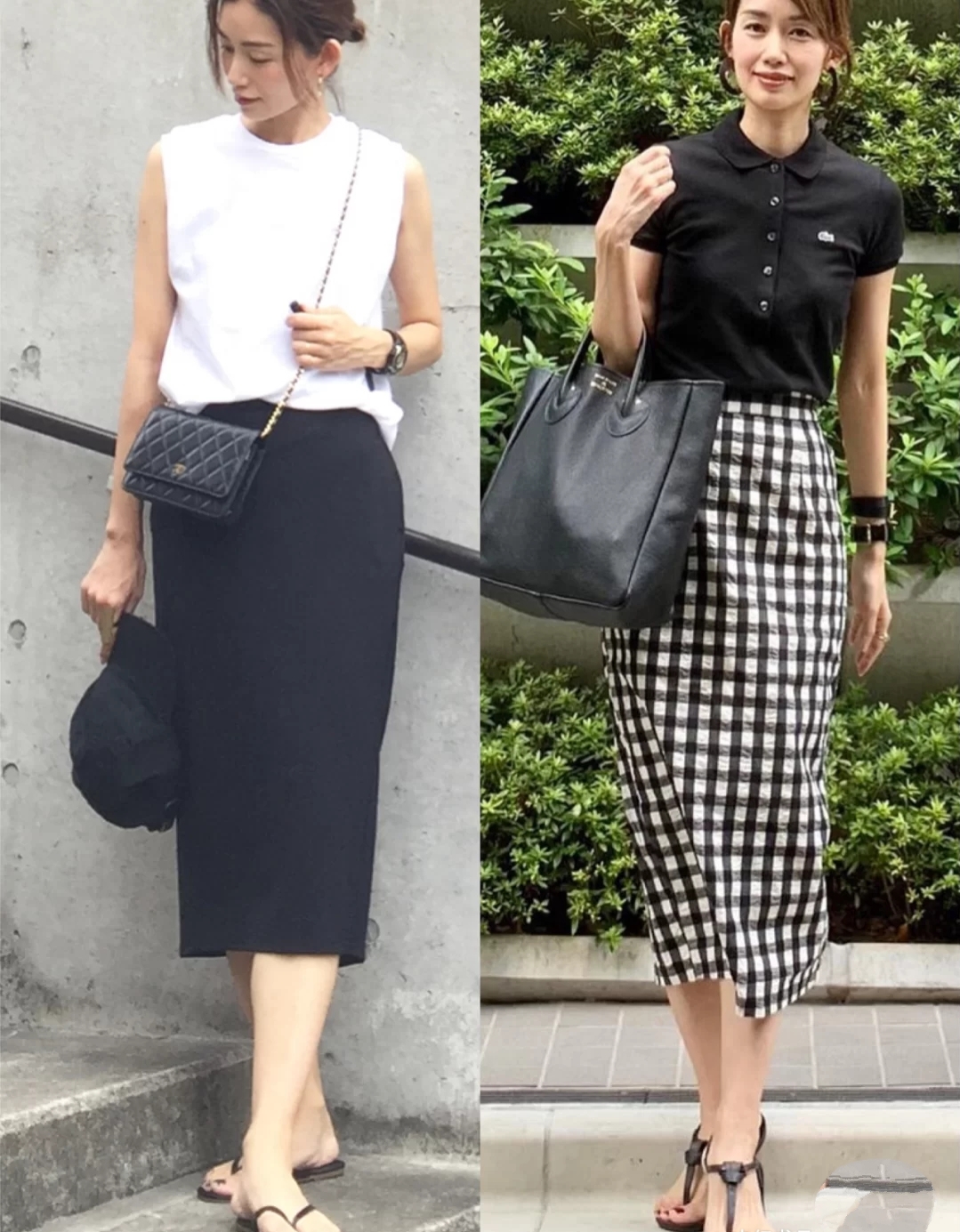 连衣裙飘逸优雅,而半裙穿对了更加有女人味。左侧白色无袖圆领背心搭配黑色高腰铅笔裙,上衣属于日式穿搭中常见基础单品,与铅笔裙组合后,配色简洁,造型优雅。左侧黑色圆领排扣衬衣搭配高腰格纹裙,低调优雅。