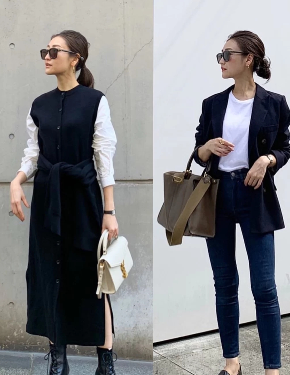黑白配色经典大方,女性年纪越大,越能体会到这种经典配色的美感。白色衬衣外搭黑色无袖排扣长裙,两侧叠加开叉设计,增添女人味,搭配黑色细带中短靴,腰间坎肩点明腰线;白色基础T恤外搭黑色西装,蓝色紧身牛仔裤利落干净。